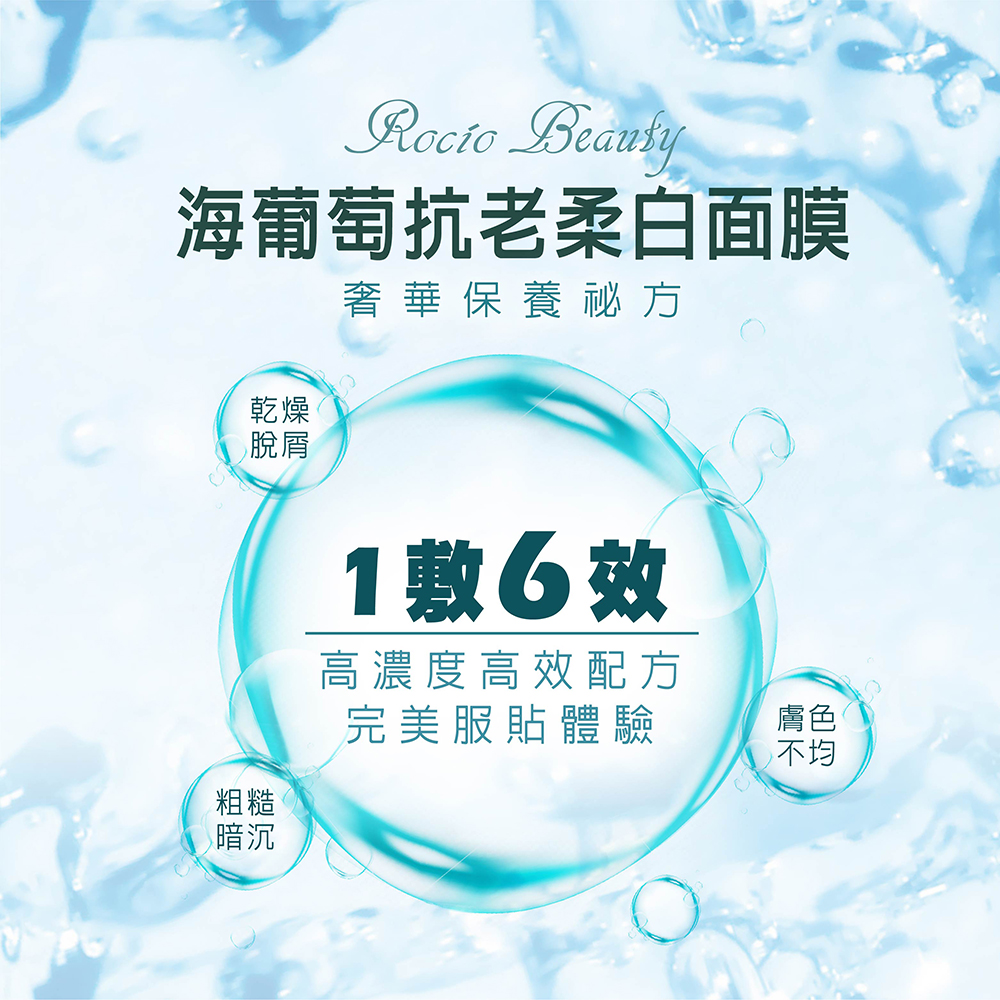 5.海葡萄抗老柔白面膜採用海葡萄植萃液,具舒敏,抗老作用,同時能增加膠原蛋白的促成